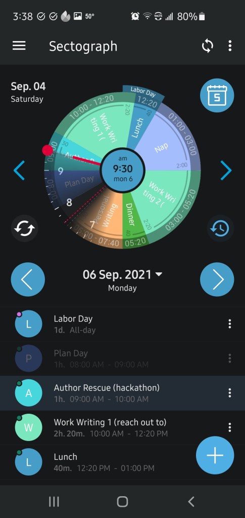 This may not be for everyone, but using Sectograph helps me better visualize my time. The idea is that instead of having blocks of time listed in a column, the length of time blocks is displayed in a circle as wedges. Since I’m used to looking at time on a clock, it helps me conceptualize how much time is being spent on tasks compared to other tasks. Personally, I color code my time management so that I can see an overall distribution. Green is work, vs. purple is breaks/downtime. The goal is to have the majority of my time be mapped as green within my work day boundaries, with evenly spaced blocks of purple for my breaks.