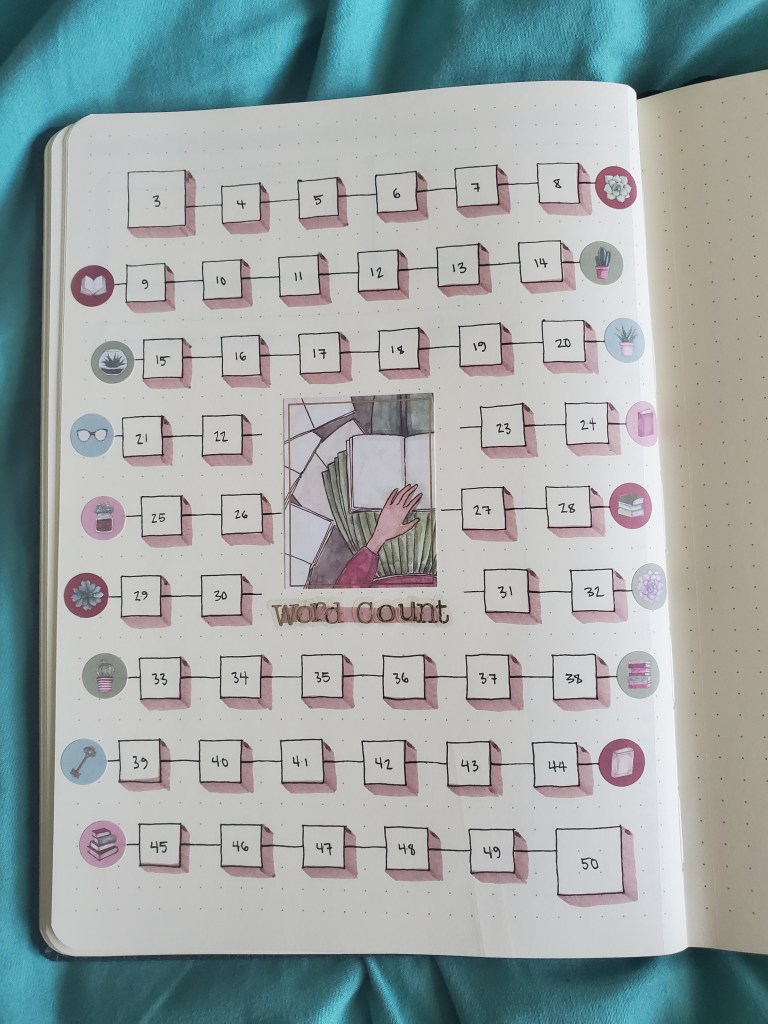 The word count tracker is pretty self explanatory, I made boxes to represent each thousand words I need to write to hit the golden 50k at the end of the month, which I can fill in as I go. I also used a bunch of stickers because aesthetics are very motivating for me. Use what you have!
