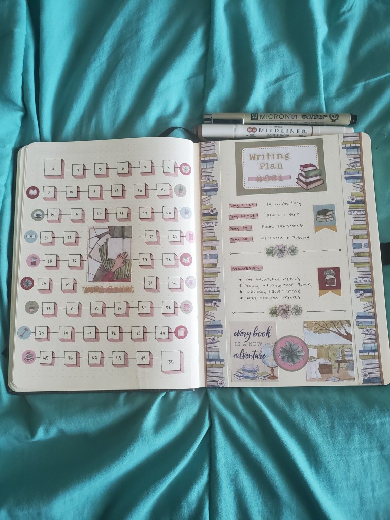 My plan for 2021 is to write 2k words a day throughout the month of November, which gives me extra buffer time to get revisions and formatting done by the end of the month. The very last day will be creating metadata for self-publishing and then publishing the work itself if I decide to! Strategies to succeed during November include using the snowflake method (which I talk about here), setting up a daily time block reserved for writing, utilizing my local library for a quiet space to write free from distractions, and keeping my bujo spreads updated for maximum motivation.